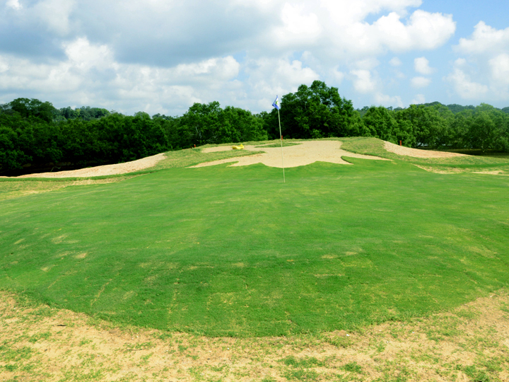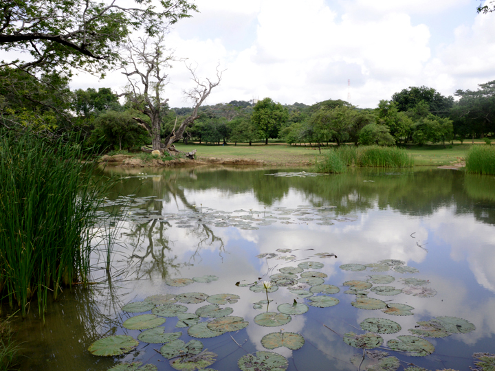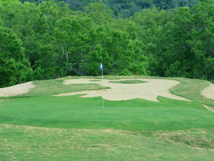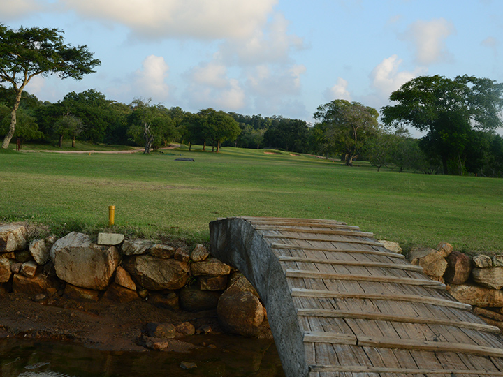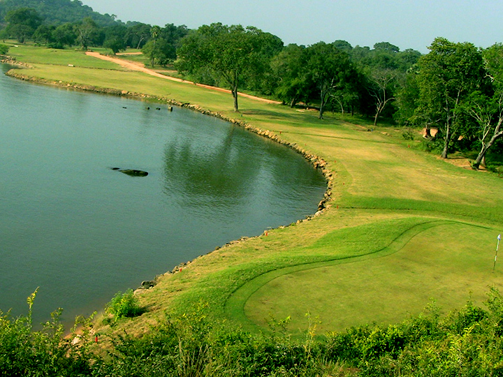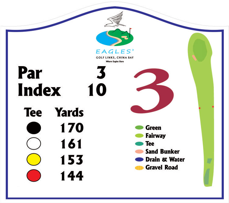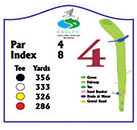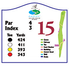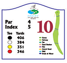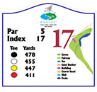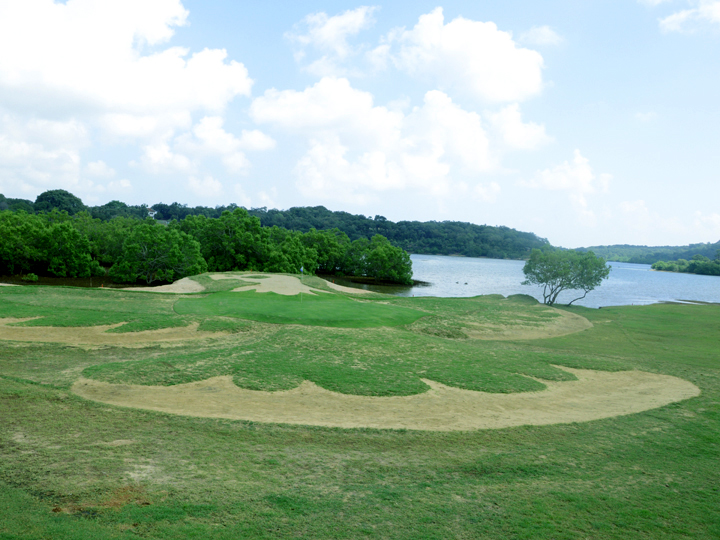 | This is an outstanding golf hole which many will say is the Signature Hole-but as the golfer will see, there are other contenders for this title. The drive from an elevated tee calls for both accuracy and strategy. The more daring player can opt for placing his tee shot well to the right skirting Snug Cove. From there a mid-iron played over the water will set up par. For the more circumspect, the safer route takes in the left side of the fairway, but this route must avoid a stately Kumbuk tree, and getting on the green in regulation may not be possible. | ||||||