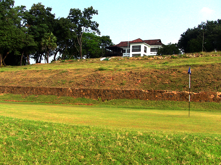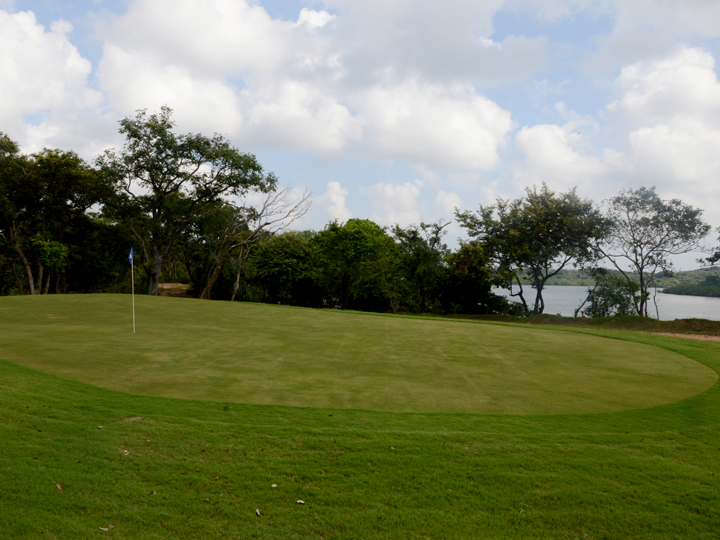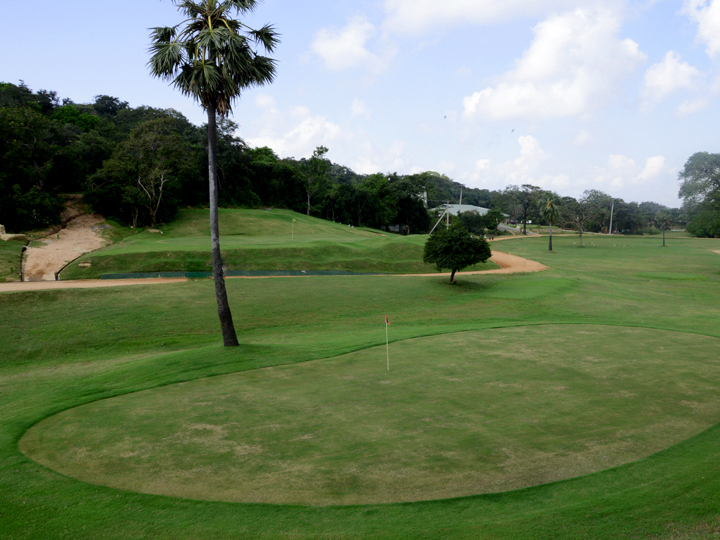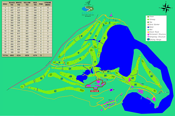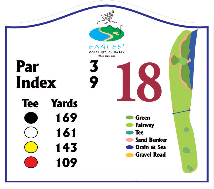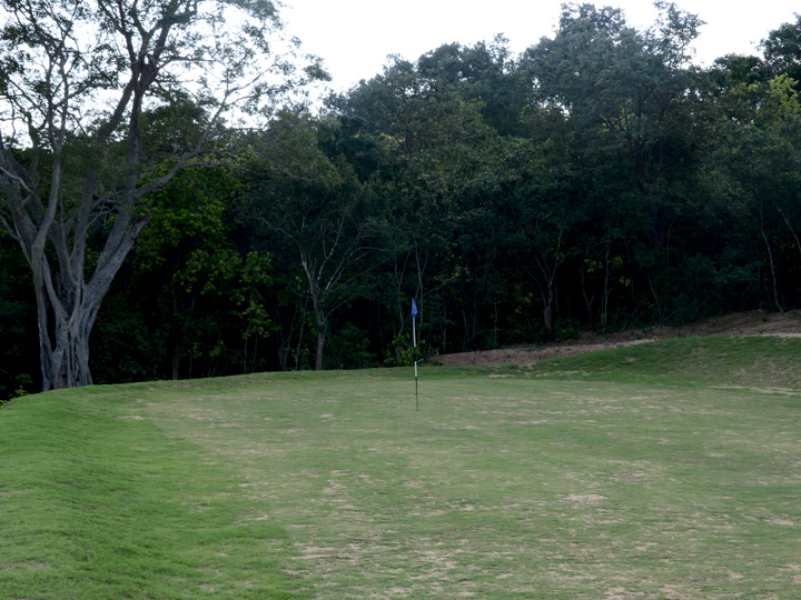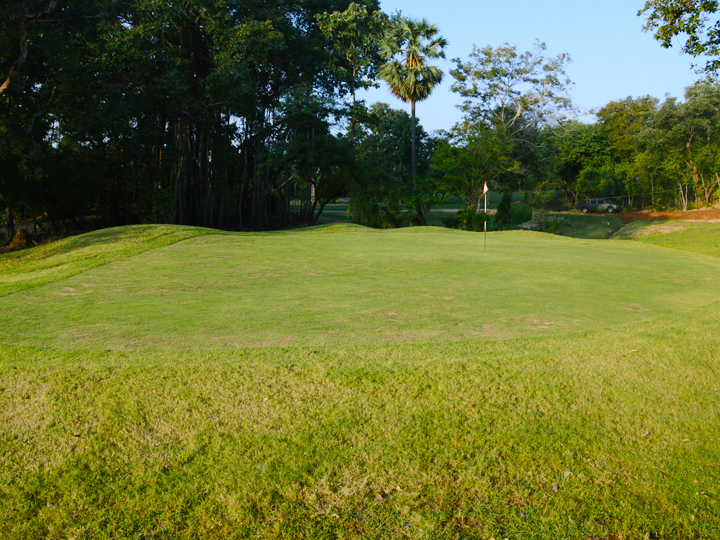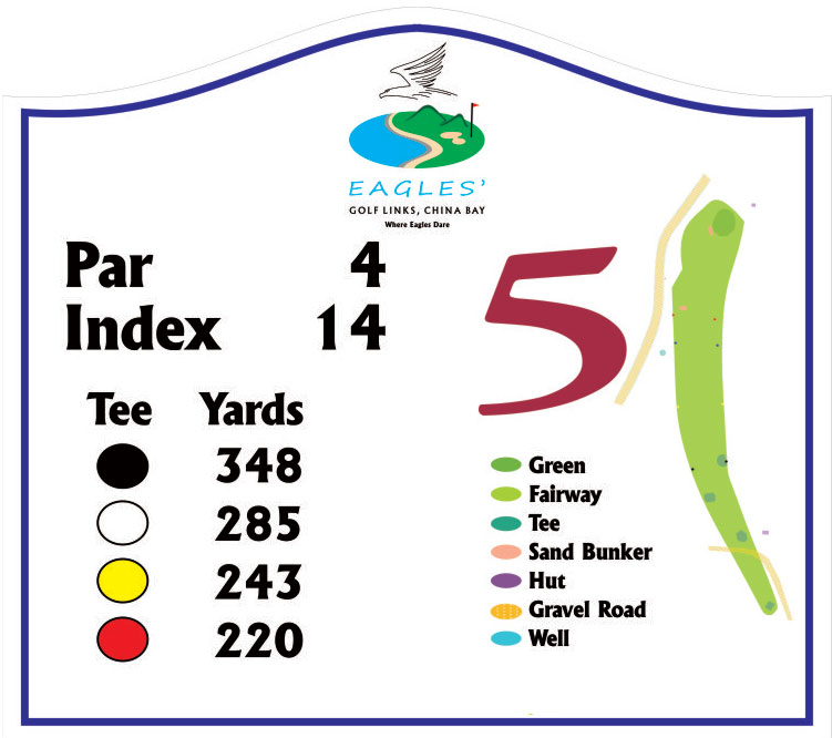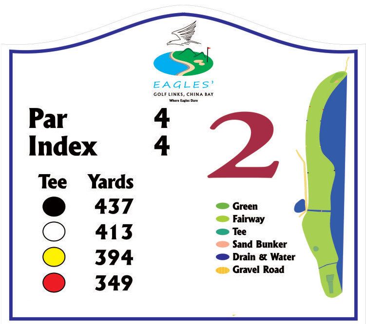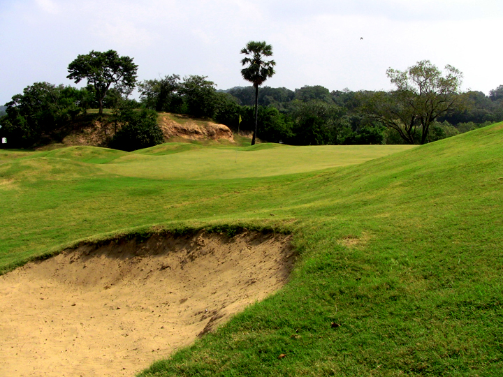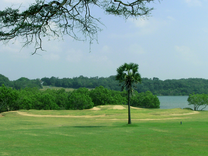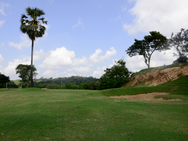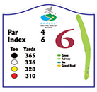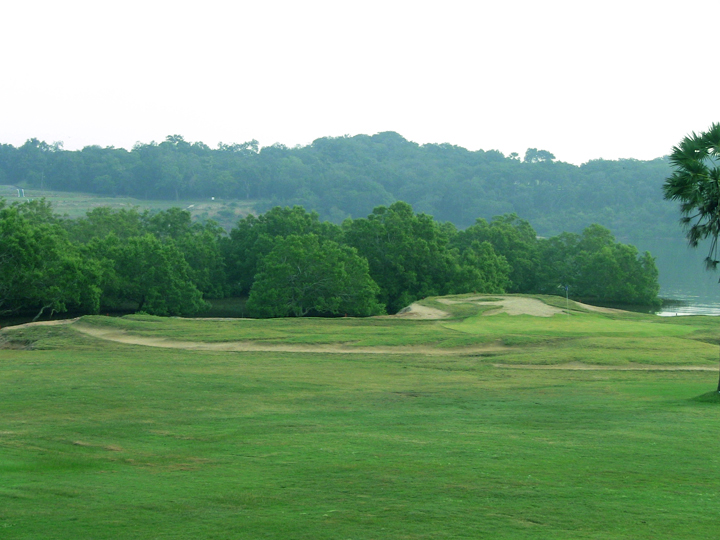 | The hole is a dogleg left and the tee shot must hug the right side of the tree-lined fairway to allow a clear approach to the green. The approach on the left is guarded by two large Palu and Tamarind trees. The green is undulating and slopes strongly towards the bay. | ||||||