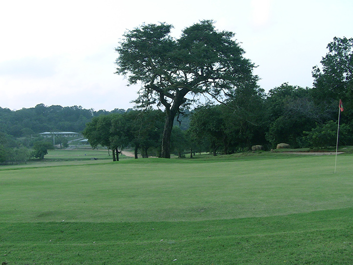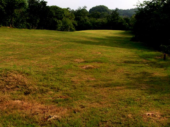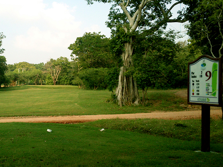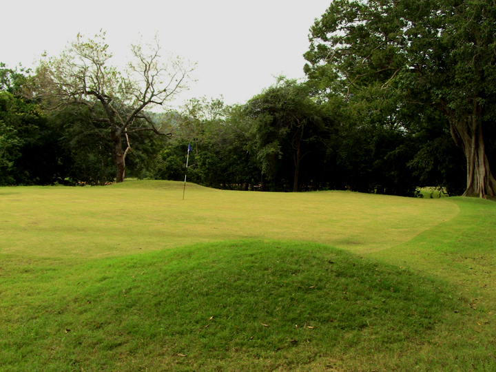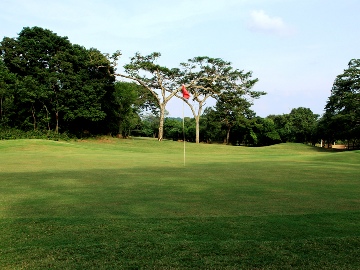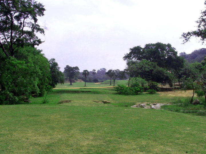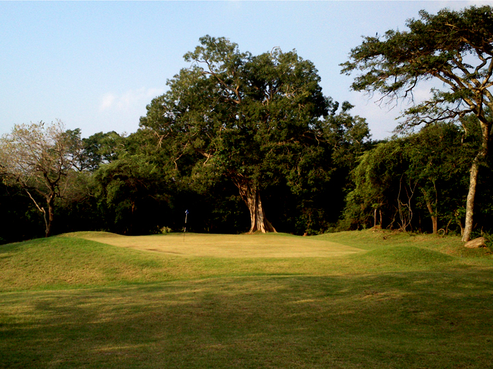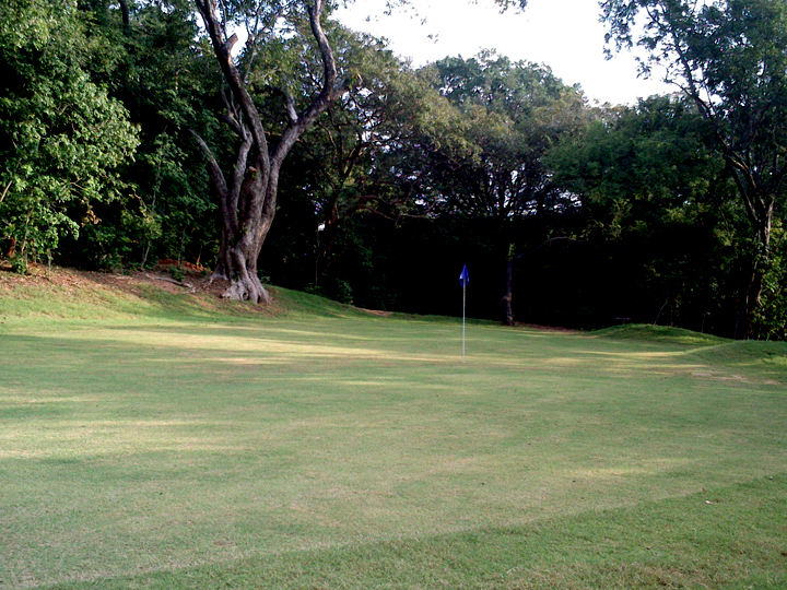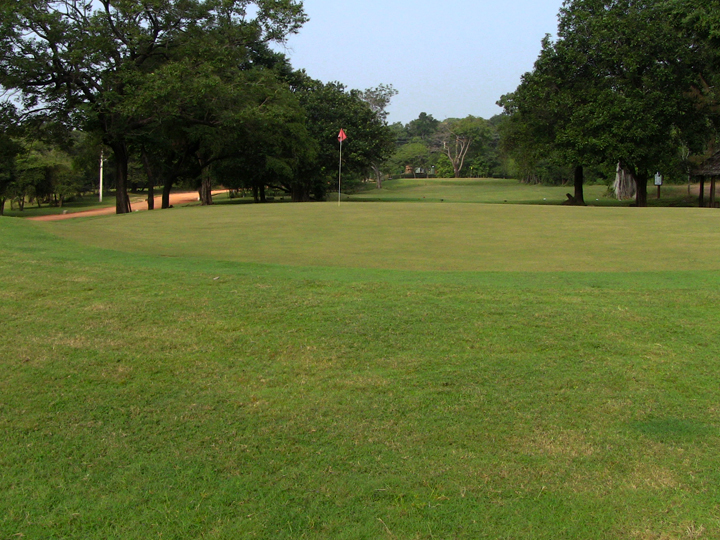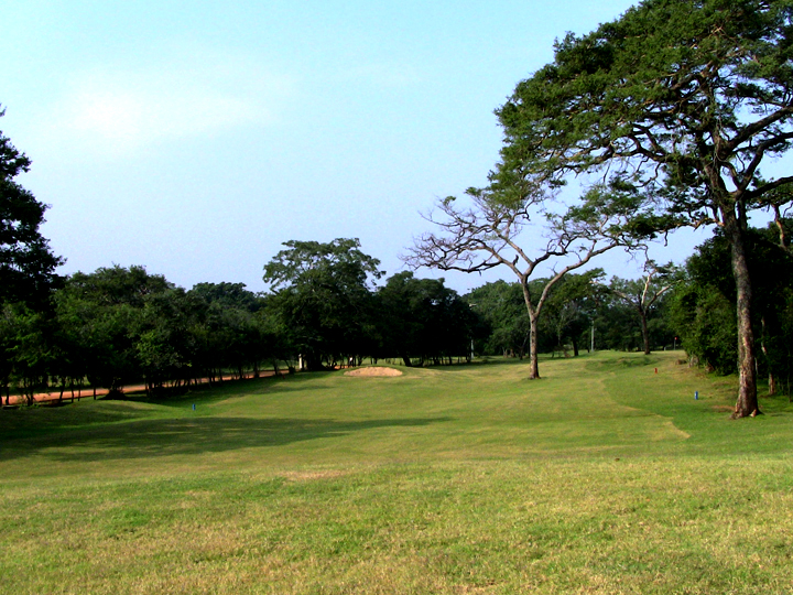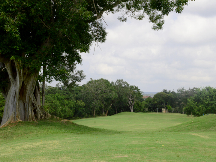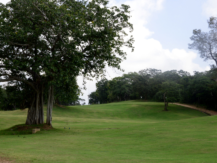 | The tee shot may be placed to the right or left of the stately Ficus tree dominating the fairway. Both approaches offer opportunities for a mid-iron to the green. Relief can be obtained from the road which borders the right side of the fairway. The ground falls away sharply to the right beyond the road. | ||||||