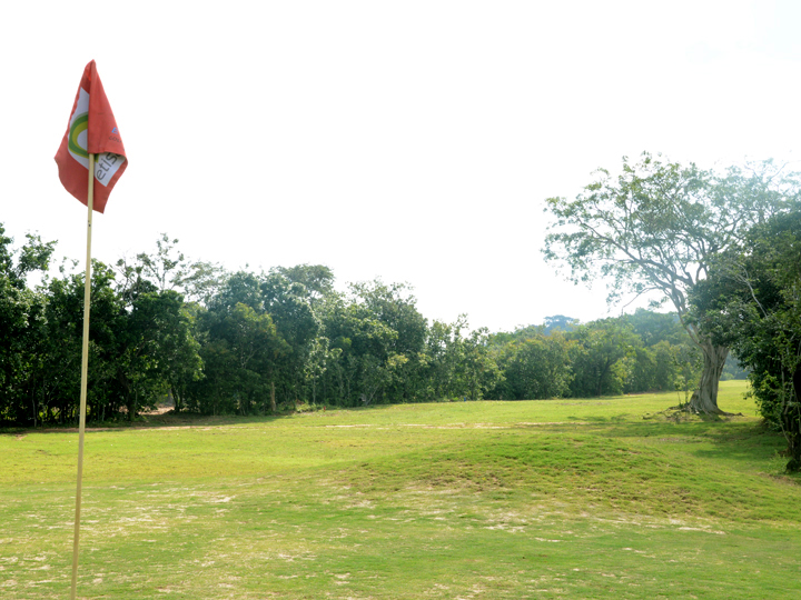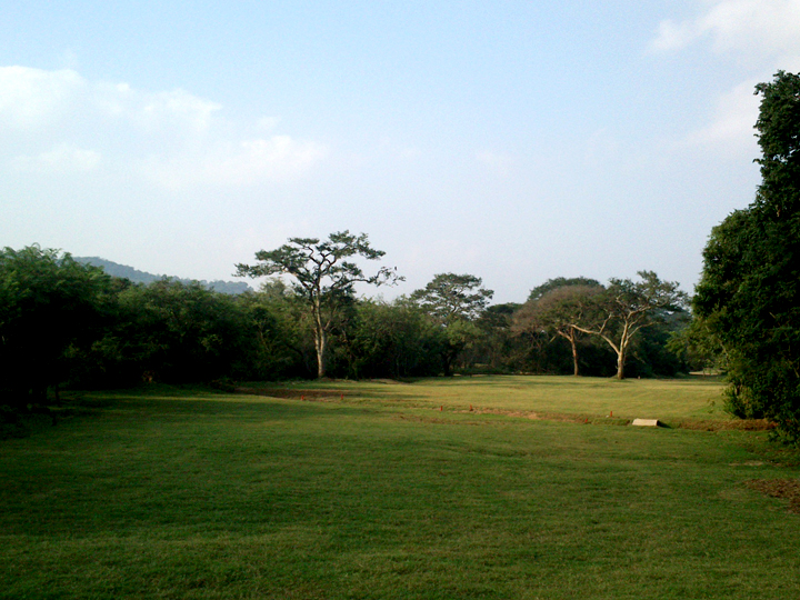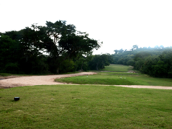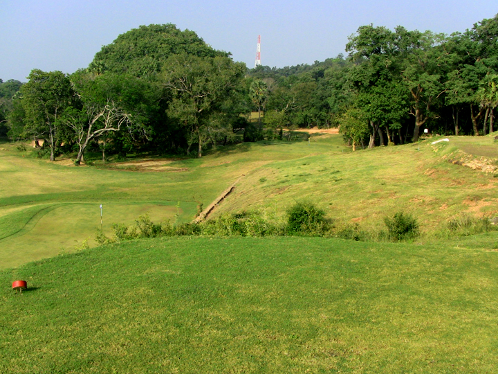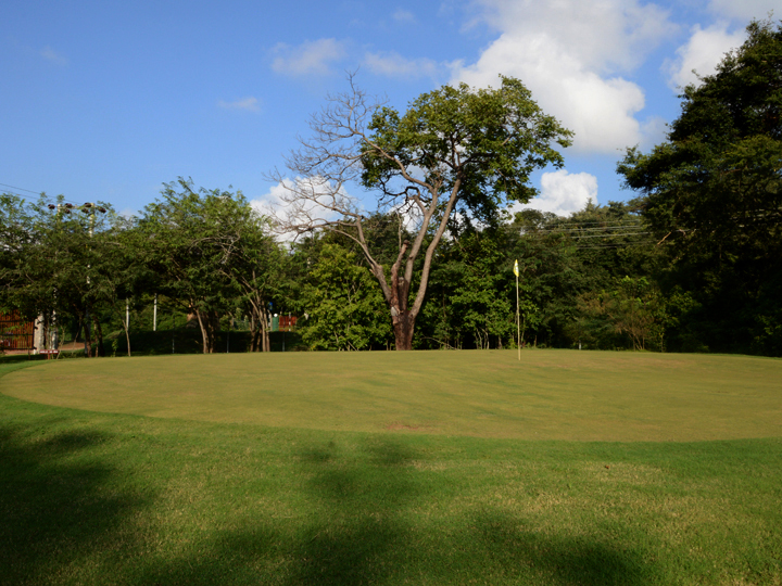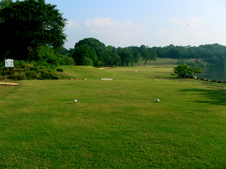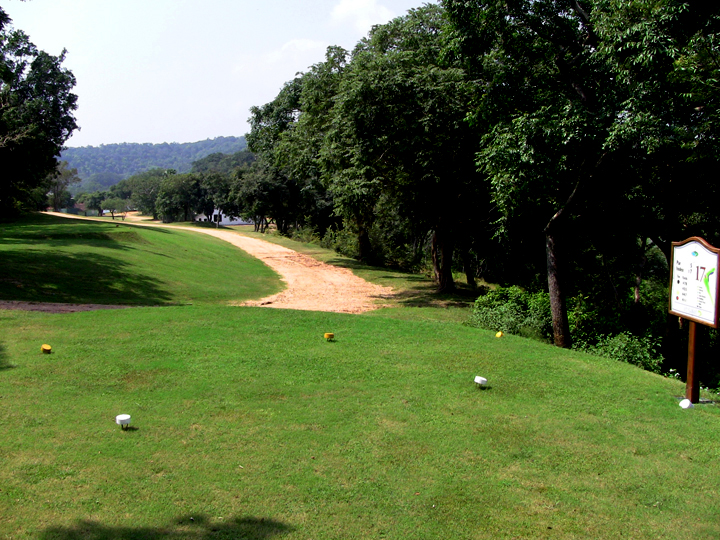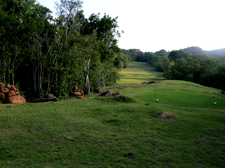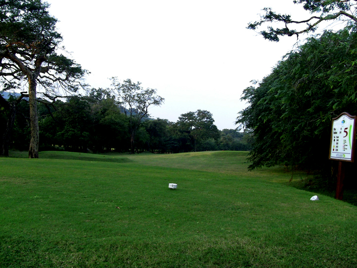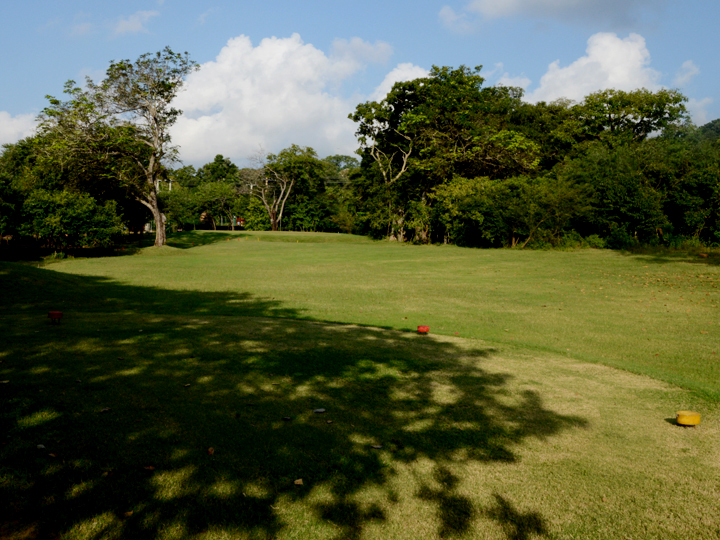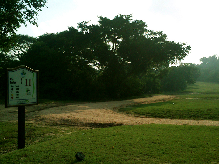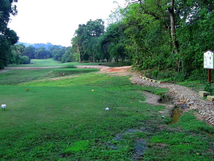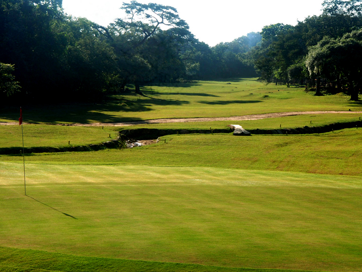 | The tee shot may be placed to the right or left of the stately Ficus tree dominating the fairway. Both approaches offer opportunities for a mid-iron to the green. Relief can be obtained from the road which borders the right side of the fairway. The ground falls away sharply to the right beyond the road. | ||||||