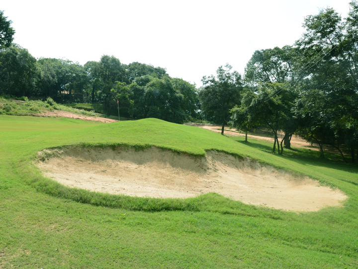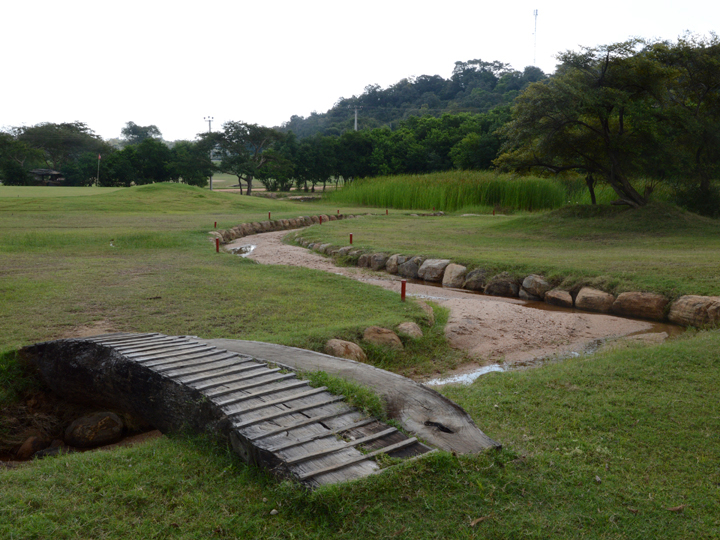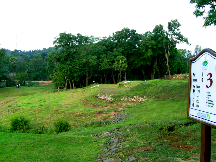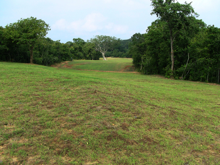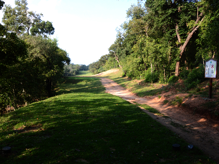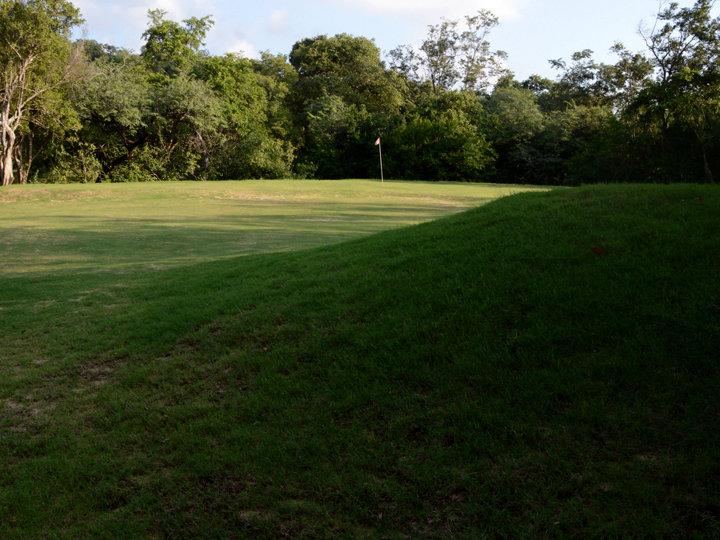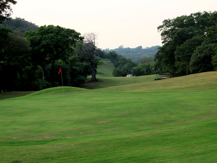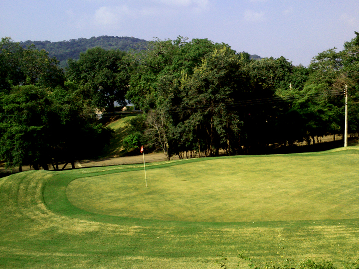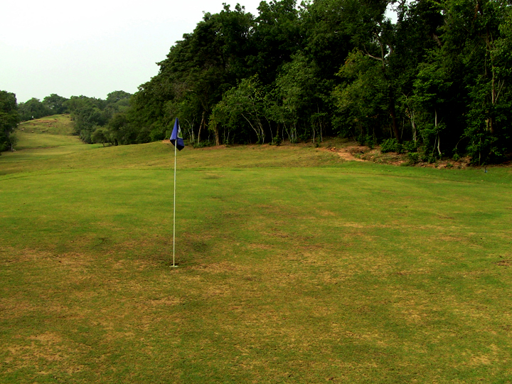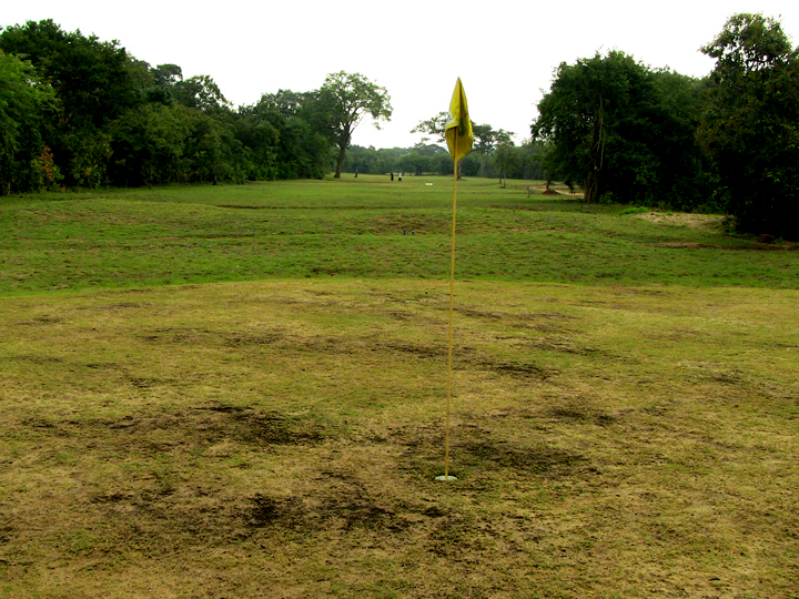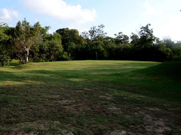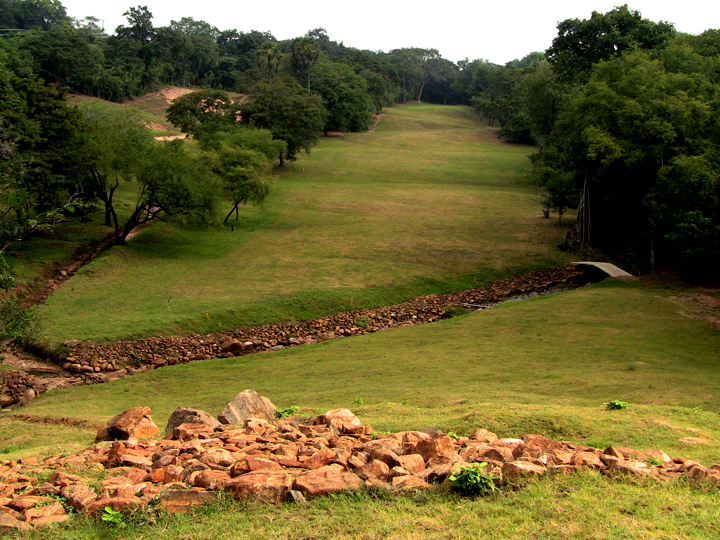| The tee shot may be placed to the right or left of the stately Ficus tree dominating the fairway. Both approaches offer opportunities for a mid-iron to the green. Relief can be obtained from the road which borders the right side of the fairway. The ground falls away sharply to the right beyond the road. | ||||||