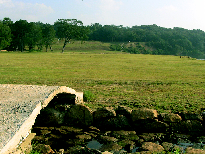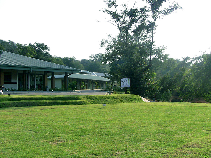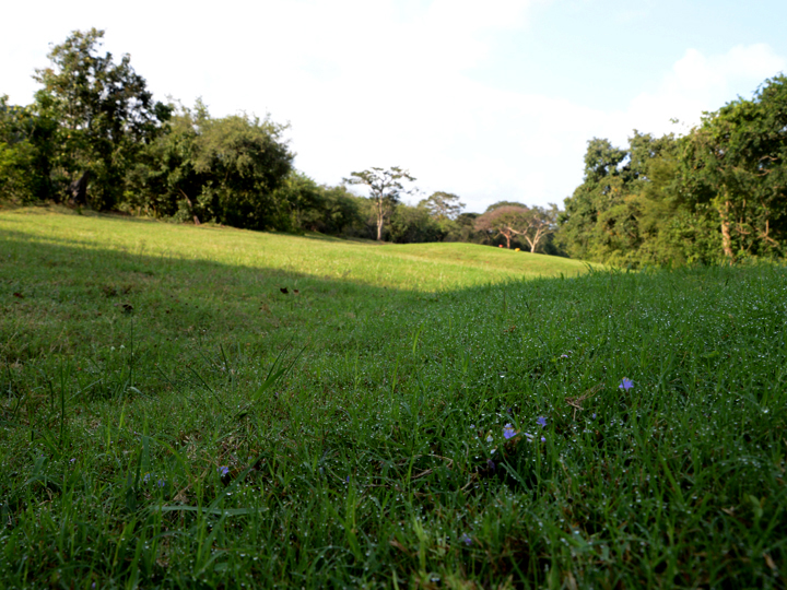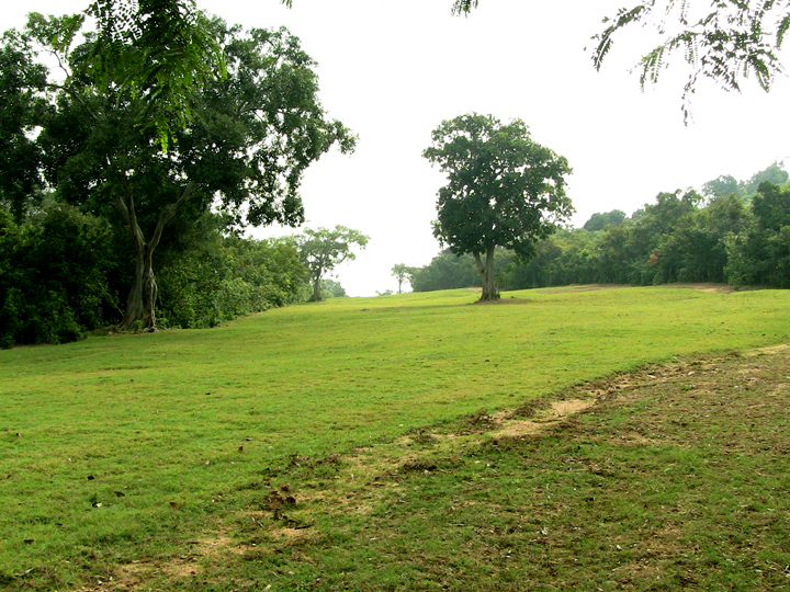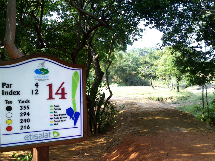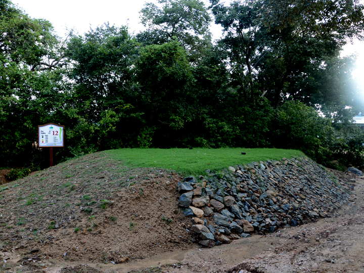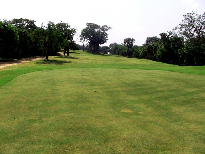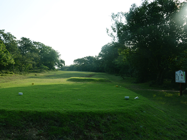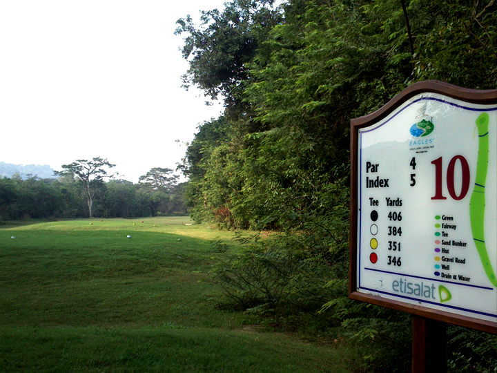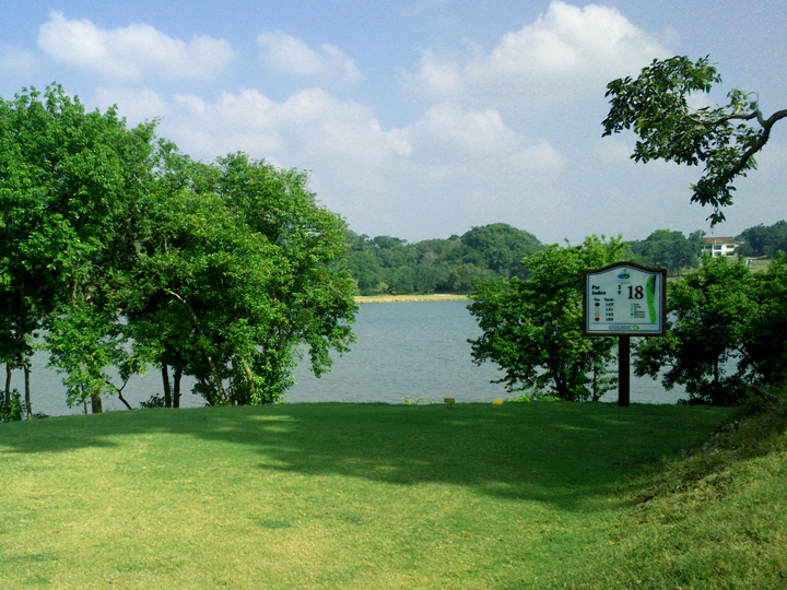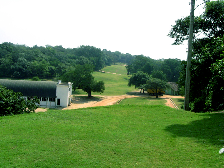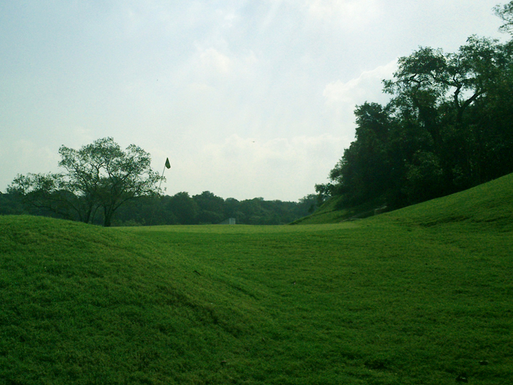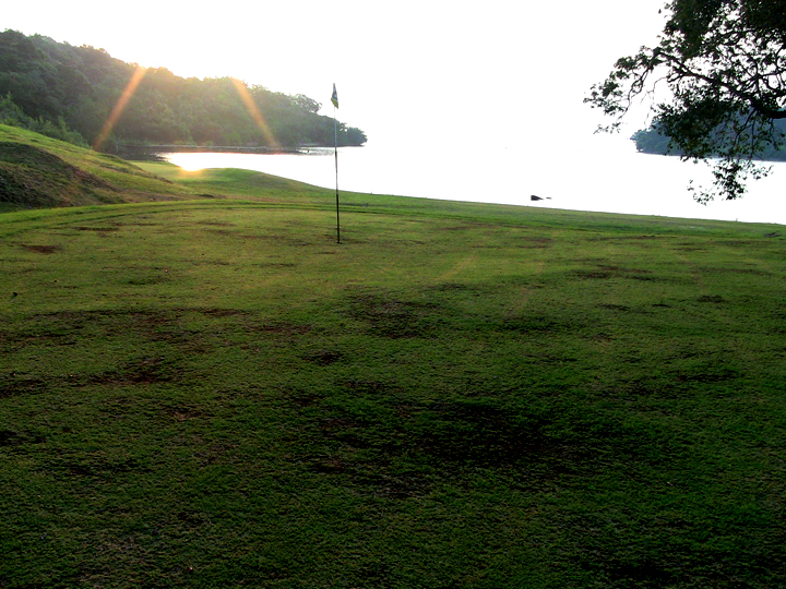| The tee shot may be placed to the right or left of the stately Ficus tree dominating the fairway. Both approaches offer opportunities for a mid-iron to the green. Relief can be obtained from the road which borders the right side of the fairway. The ground falls away sharply to the right beyond the road. | ||||||