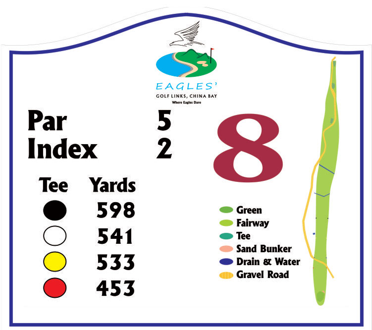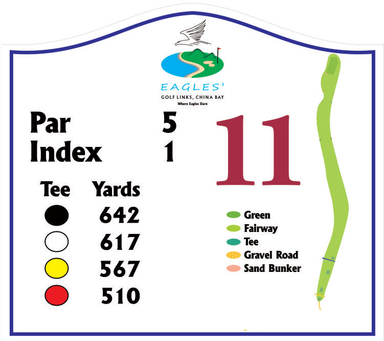 | This par 5 is the longest hole on any course in the island, and its length, and the fact that the fairway rises from the tee to the green make this a very demanding hole indeed, which is justifiably rated as Stroke Index 1 on the course. The fairway takes a slight double bend. The tee shot must be placed to avoid the tree on the right of the fairway. Most players will need three well-struck woods to reach the large elevated green. | ||||||