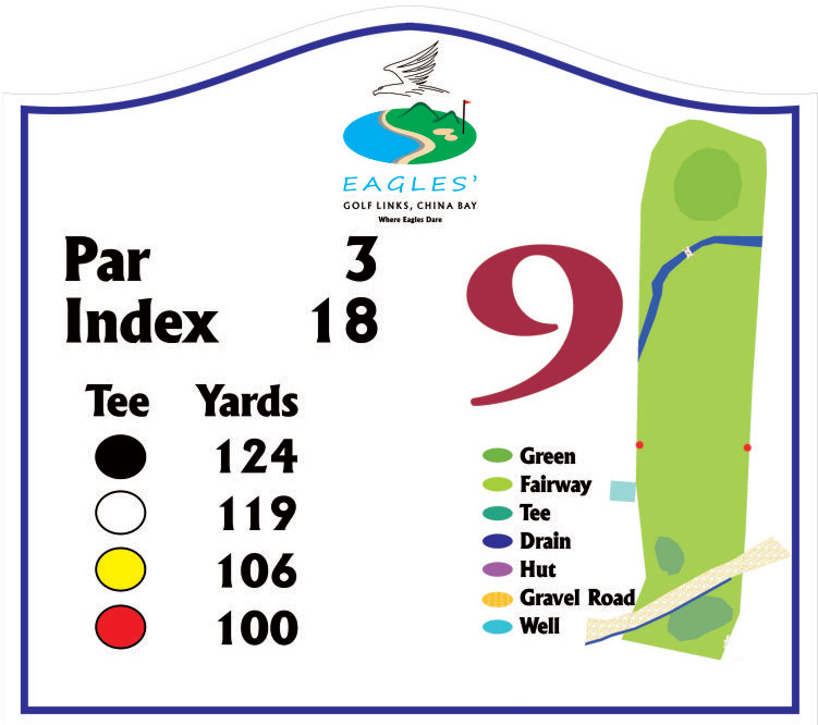 | This hole will provide some relief from the exertions on the 8th, but care is necessary as the green slopes down to a deep drain which will punish an overly conservative club selection. Over-clubbing will result in a rather testing down hill approach. | ||||||